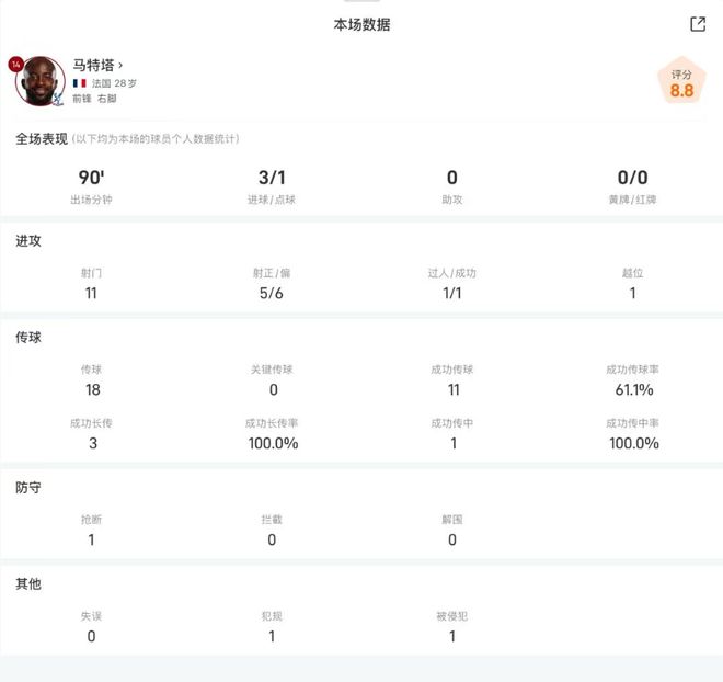 马特塔对阵伯恩茅斯全场比赛主要数据: